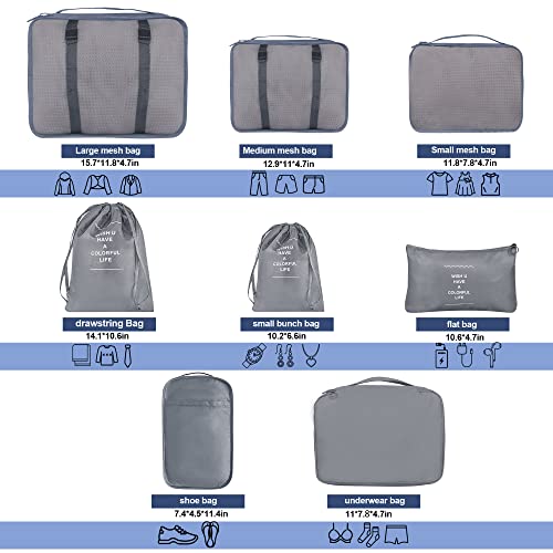 8 Set Packing Cubes for Suitcases, kingdalux Grey Travel Luggage Packing Organizers with Laundry Bag, Compression Storage Shoe Bag, Clothing Underwear Bag, for Women & Man
